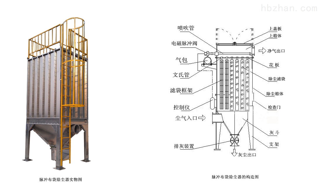 布袋式除塵器屬于環(huán)保設(shè)備的一種,作用是大氣污染治理,過濾粉塵廢氣。主要由上箱體(凈氣室)、中箱體(塵氣室)、灰斗、脈沖清灰系統(tǒng)、濾袋、濾袋骨架、進(jìn)出風(fēng)口、壓差計(jì)、檢修人孔、卸灰裝置、和pLc控制儀等組成。